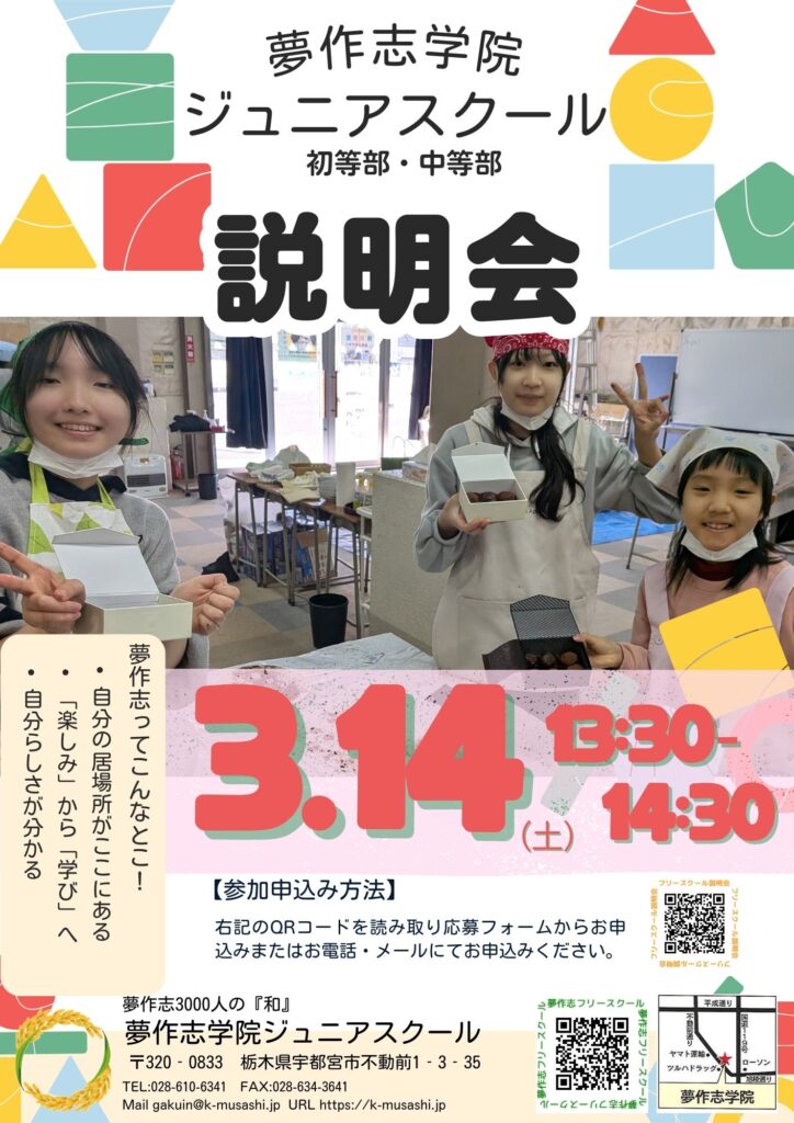 夢作志学院ジュニアスクールでは、3月14日(土)にフリースクール説明会を開催いたします。