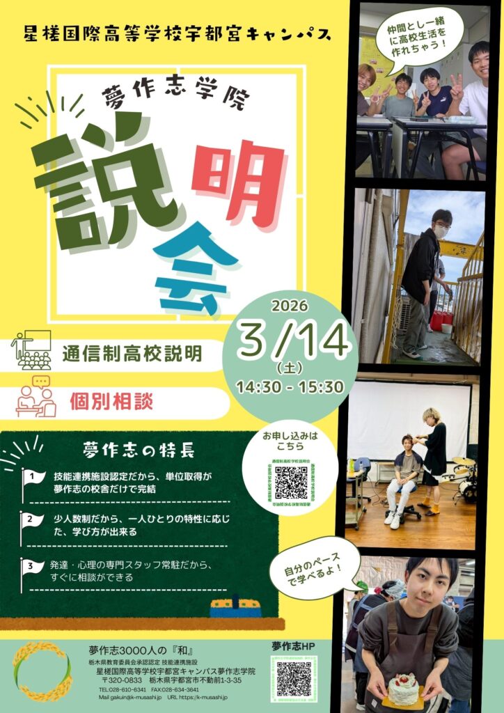 星槎国際高等学校 宇都宮キャンパス 夢作志学院の説明会を開催いたします。