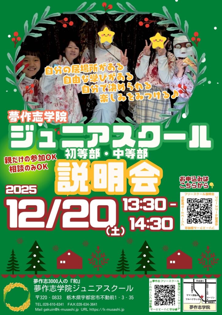 夢作志学院ジュニアスクール(初等部・中等部)では、12月20日(土)13:30~14:30 に学校説明会を開催いたします。