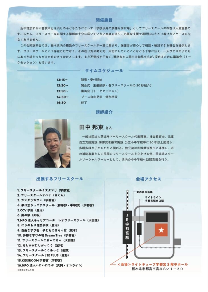 栃木県内のフリースクール 16校 が一堂に会する、年に一度の合同説明会を開催します!